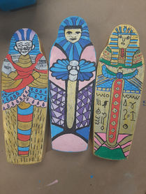 Students learned how to write in Heiroglyphics on real papyrus, then built a pyramid out of cardboard. The sarcaughagus had 3, nexted boxes (just like King Tut). Students even created a mummy out of clay and wrapped it in cotton. Students painted life size Sarcaughagus and made their own Canopic Jars, with accurate heads of the four sons of the Egyptain God Horus.